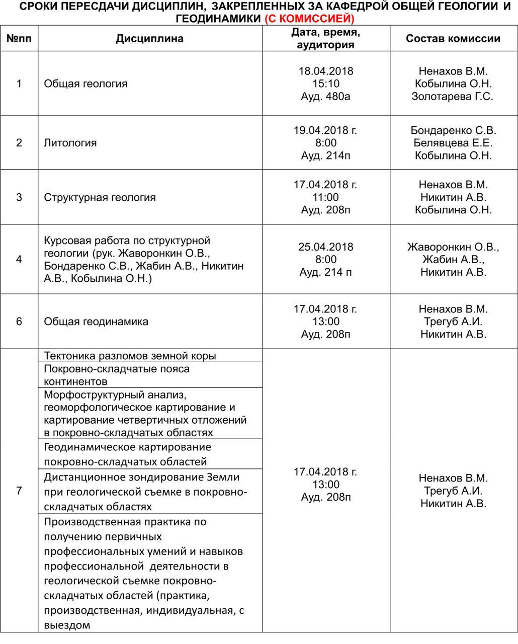 График пересдачи С КОМИССИЕЙ дисциплин, закрепленных за кафедрой общей геологии и геодинамики.