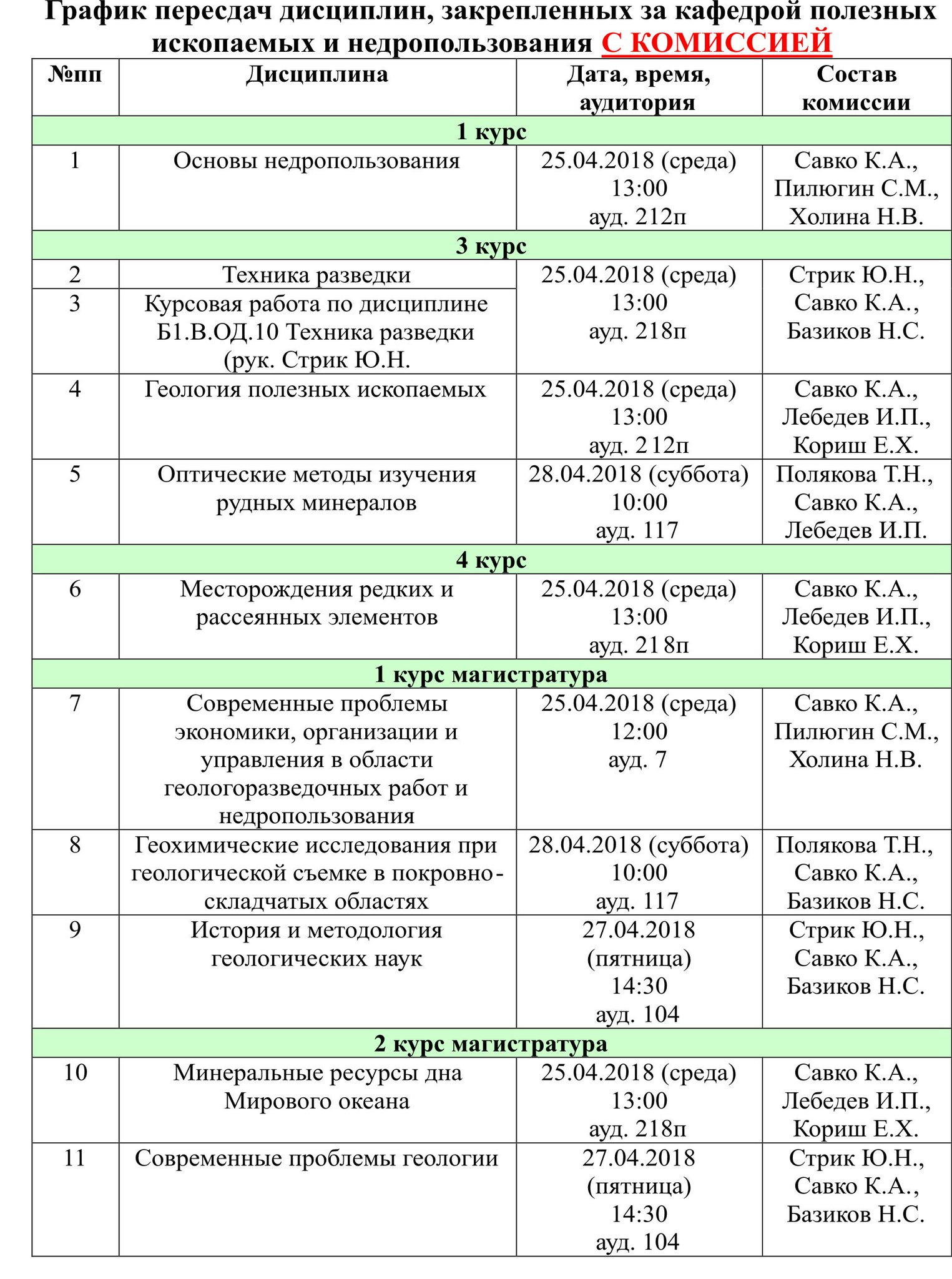 График пересдач дисциплин, закрепленных за кафедрой полезных ископаемых и недропользования С КОМИССИЕЙ