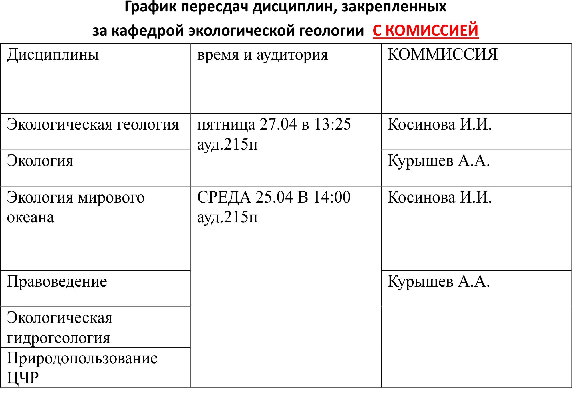 - График пересдач дисциплин, закрепленных за кафедрой экологической геологии С КОМИССИЕЙ